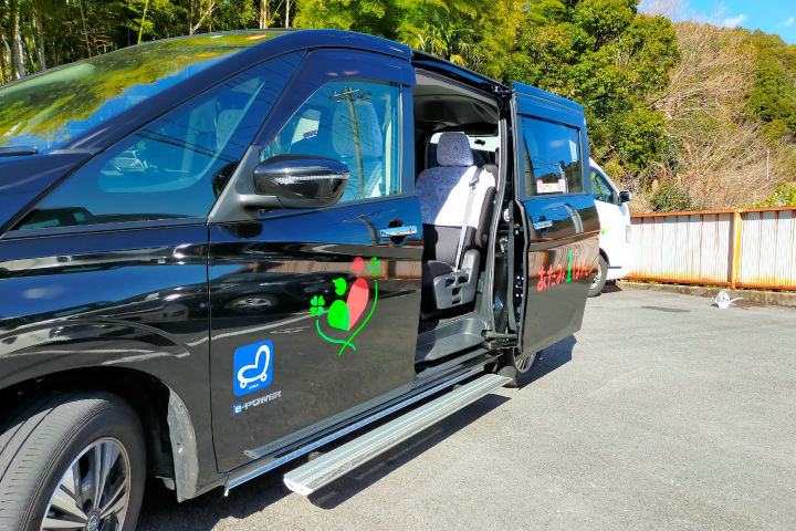 広い車内、乗り降りの簡単な後部スライドドア、車いすも大きな乗降口で快適にご利用いただけます。車いす以外でも足腰の弱い高齢の方、ベビーカーご利用の方など、お気軽にご利用ください。
